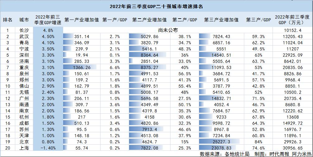 据时代周报记者统计,截至11月2日,从目前已公布前三季度经济数据的城市来看,全国GDP前20强的城市依次为上海、北京、深圳、重庆、广州、苏州、成都、杭州、武汉、南京、天津、宁波、青岛、无锡、长沙、郑州、佛山、泉州、南通和济南。