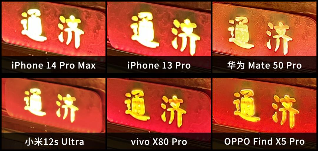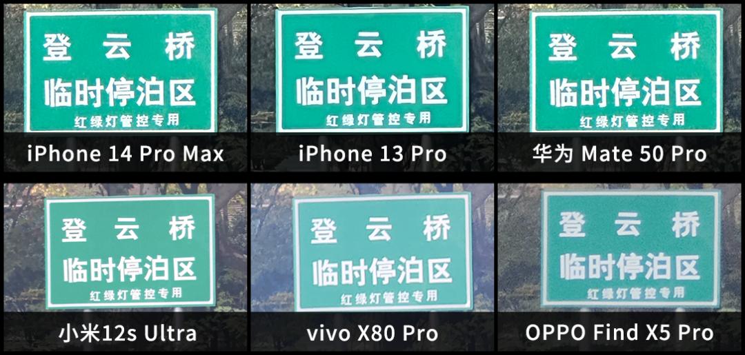 长焦拍摄远处字体的效果,几台自带潜望镜头的手机表现都很不错,iPhone 14 Pro Max 在字体边缘的观感上,要比 1200w 像素的 13 Pro 更舒服些。