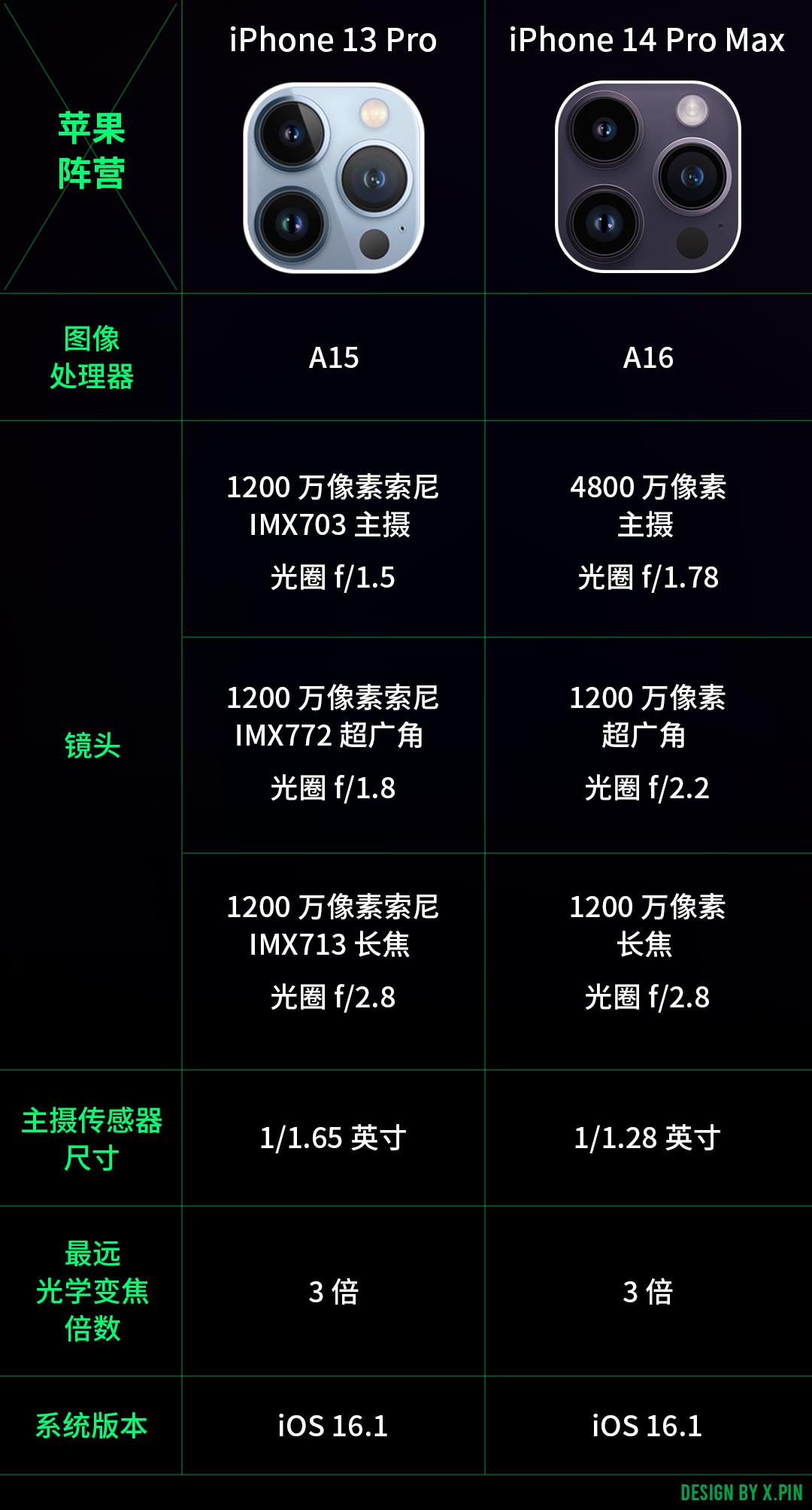 从参数上来看,14 Pro Max 相比 13 Pro 在像素、传感器尺寸上都有了很大提升,不过 14 Pro Max 的光圈相比 13 Pro 要小了一点。
