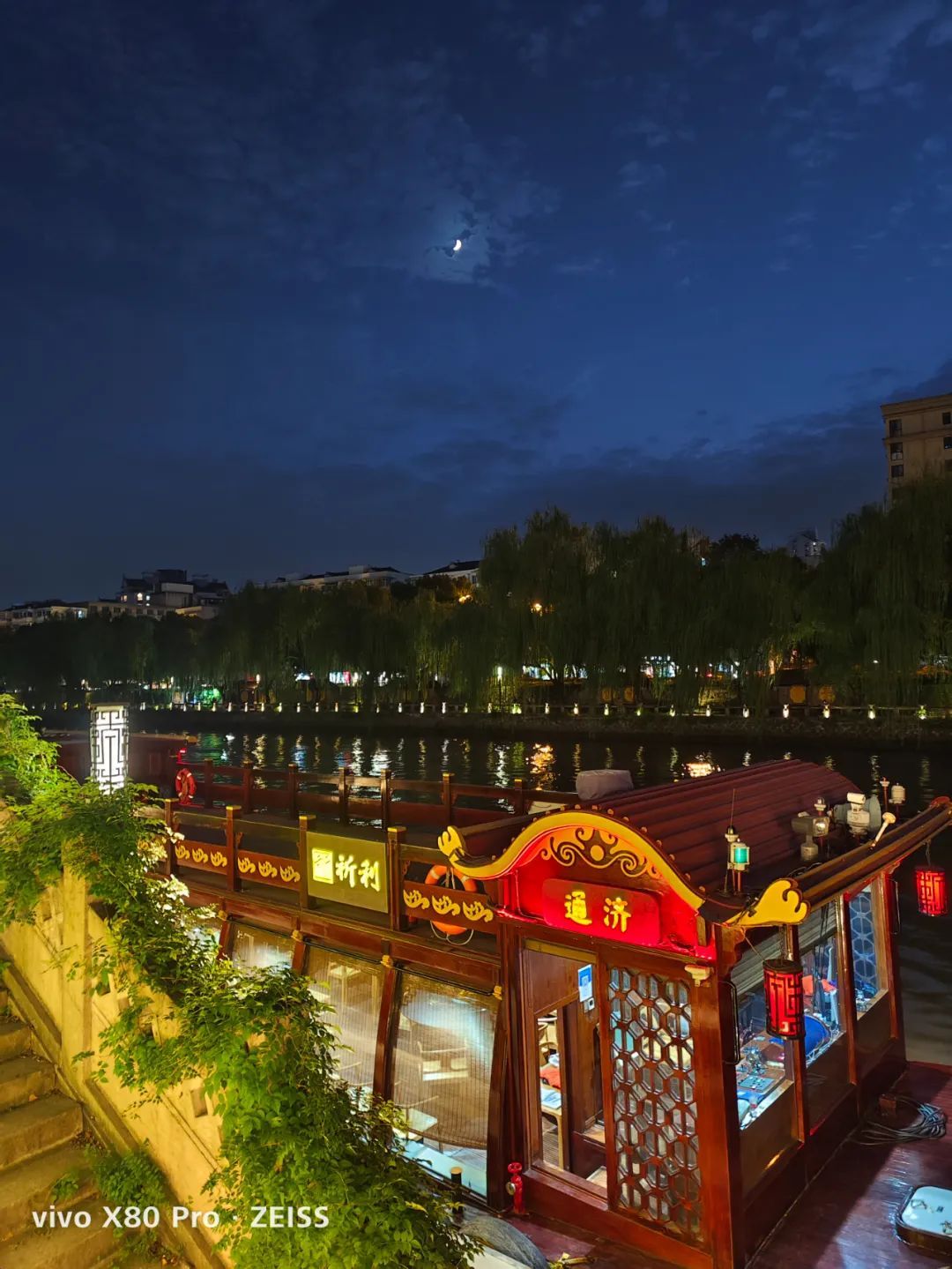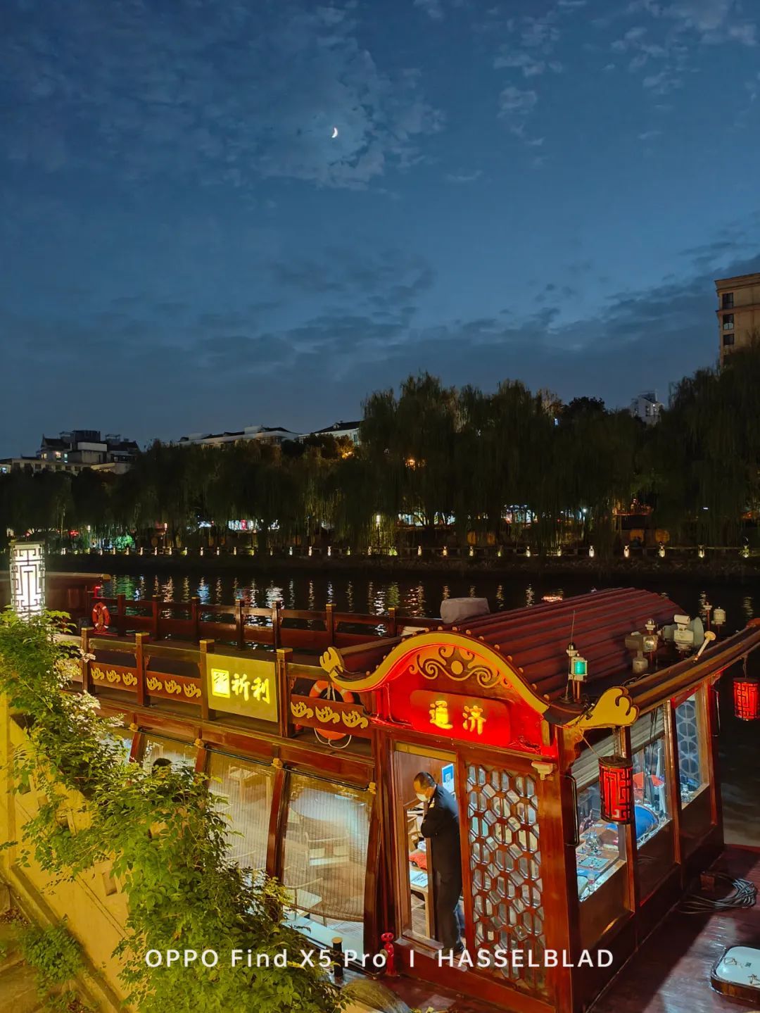 放大看船上的 LED 广告灯,蓝绿两厂的算法相对通透一些,没有过曝。