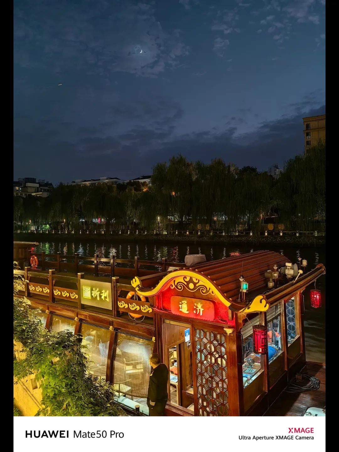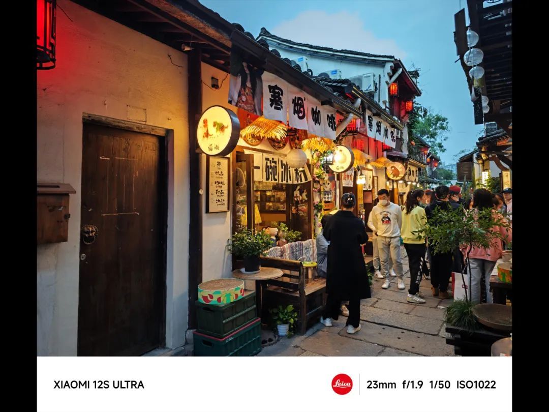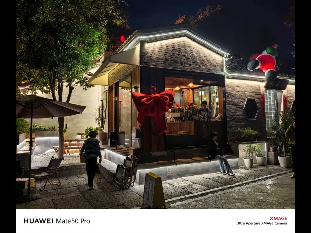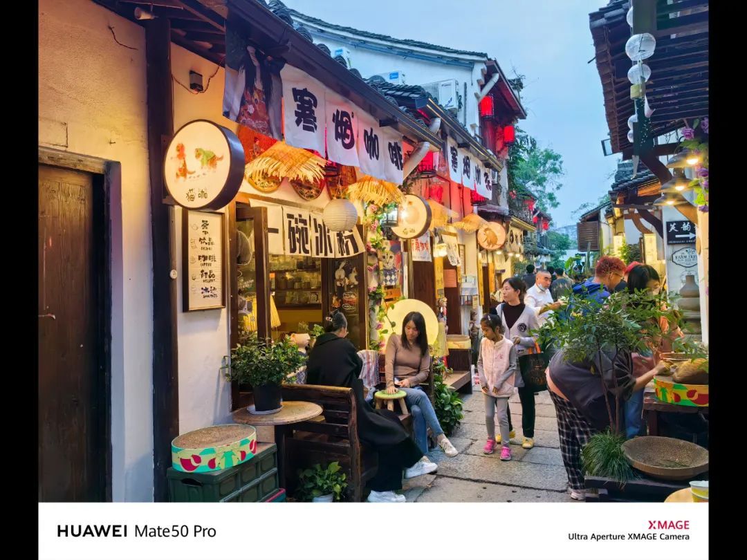 在这组光源比较多的拍摄环境中,华为 Mate 50 Pro 在天色的还原、店招灯的曝光处理上,要更胜一筹。