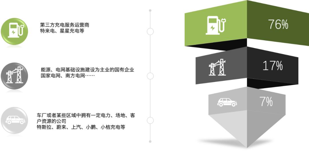 以推广新能源汽车产品为主要目的的整车企业,如特斯拉、蔚来、上汽、小鹏,以及在某些区域中拥有一定电力、场地或者客户资源的公司,比如滴滴旗下的小桔充电,上汽旗下的上汽安悦,占据了剩下的7%的份额。(整体布局如图)