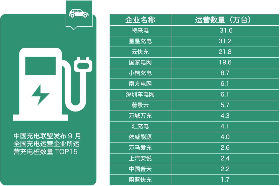 最头部的是特来电、星星充电等第三方充电服务运营商,他们的母公司大多与汽车、充电设备等行业相关,占据了公共充电桩运营市场份额的76%。根据中国充电联盟的数据,截止到2022年9月,第三方充电服务运营商的运营数量为124.7万台,其中特来电、星星充电、云快充位列前三名,运营数量分别为31.6万台、31.2万台、21.8万台。