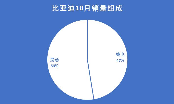 具体到动力形式上,比亚迪10月份纯电车型销量为103157辆,占总销量的47.4%,混合动力车型销量为114361辆,占比为53.6%。