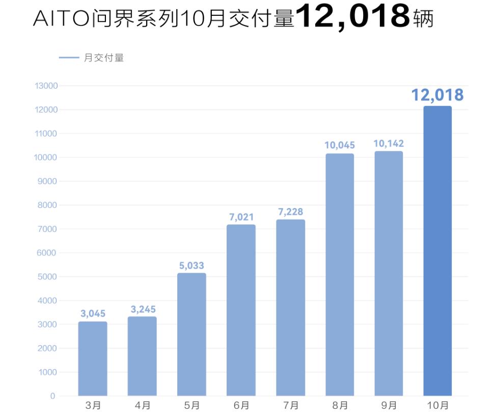 先说问界,10月份交付量来到12018辆,环比上个月增长18.5%,排名从上个月的第7位一举跃居第3。