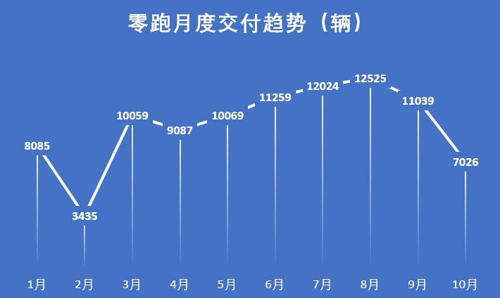 数据显示,零跑10月份的交付量为7026辆,环比上个月下跌36.35%,这个数字也创下近8个月以来的最低值。