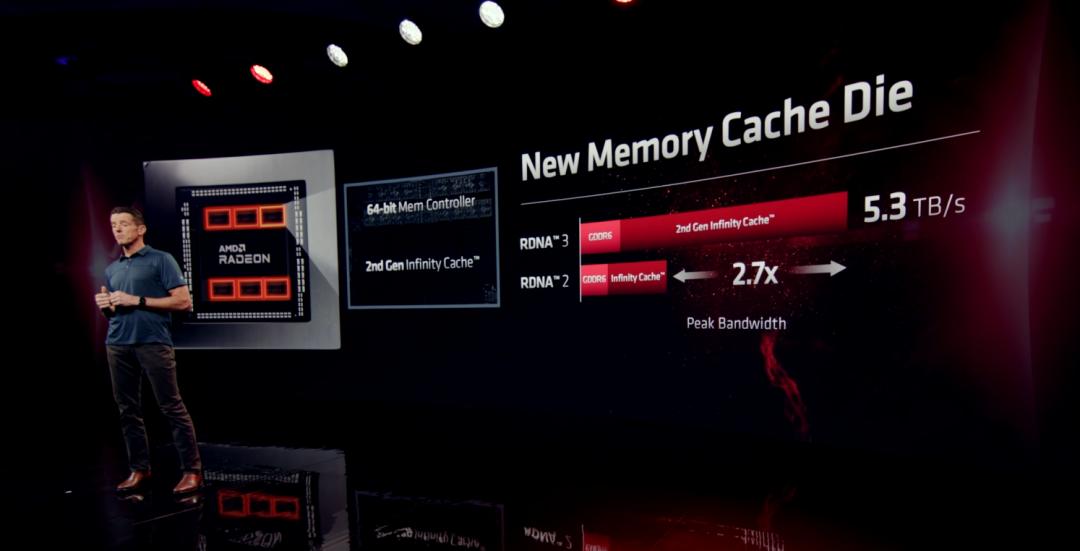 缓存性能一直是AMD芯片的优势项目,这次GDDR6配合第二代Infinity Cache技术,RDNA3显存+Infinity Cache的峰值带宽可以来到5.3TB/s,相比上代提升了2.7倍。