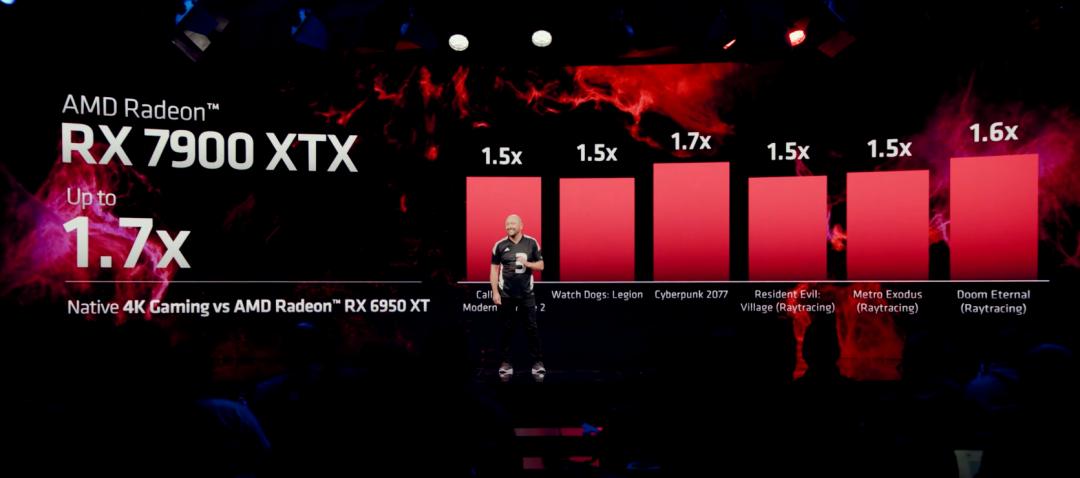 AMD上来直接公布了RX 7900 XTX的4K游戏性能,根据官方数据,其4K游戏帧数相比上代旗舰RX 6950 XT,最高提升了70%,而光追游戏最大提升幅度也有60%。
