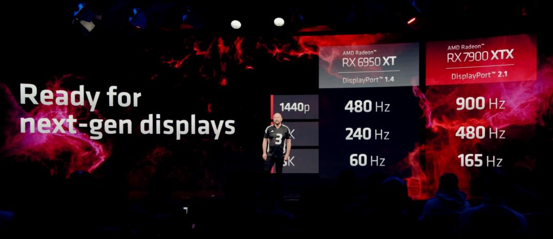 在DP2.1接口的支持下,RX 7900 XTX最高可以支持2K 900Hz、4K 480Hz或8K 165Hz显示,相比此前的DP1.4接口,最高刷新率支持有着翻倍式提升。