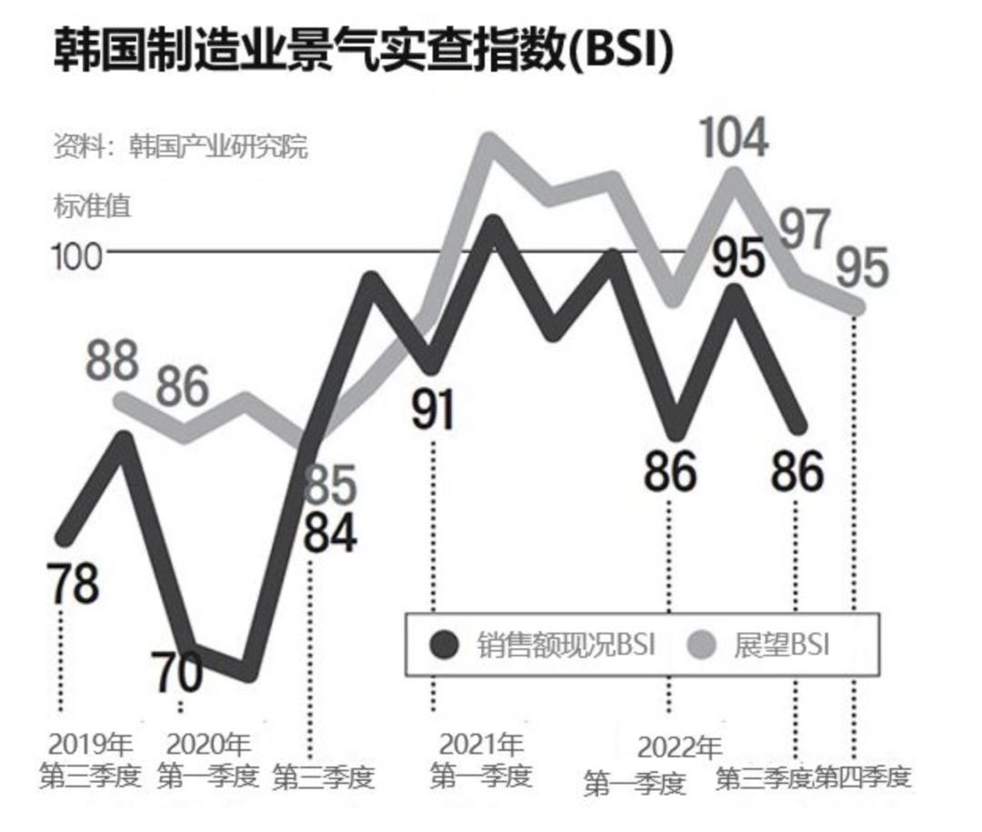 数据显示,韩国70%的制造企业表示汇率导致原材料价格上涨,经营难以为继。韩国今年第四季度的制造业经济前景比第三季度更为黯淡。