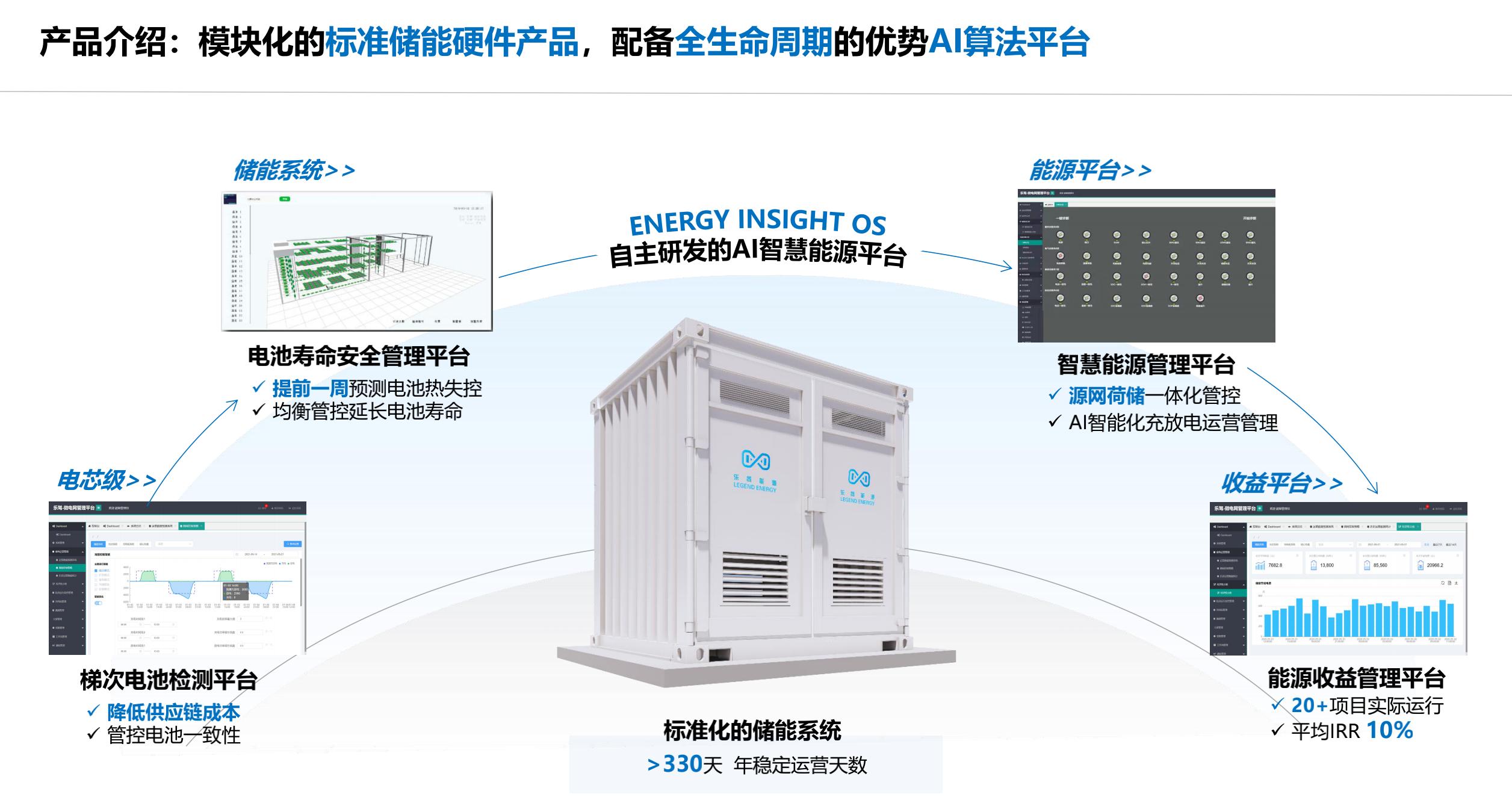 成立的头5年,AI算法开发、储能系统生产制造两条路线并行,落点都是储能。“储能是开启智慧能源的核心钥匙,得储能者得智慧能源。在我们团队看来,储能那个节点是(行业中)最关键的、数据节点最多的场景,所以我们花了更大的时间和精力。”