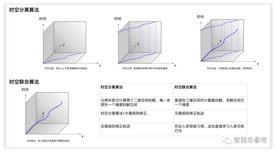 同时考虑空间和时间来规划轨迹,而不是先单独求解路径,在路径基础上再求解速度从而形成轨迹。将「横纵分离」,升级为「横纵联合」,能直接在x-y-t(即平面和时间)三个维度的空间中直接求解最优轨迹。