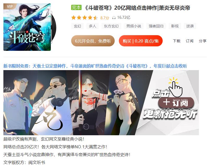 以有声书为例,这是一种延续网文IP生命力的有效形式,网文作品在有声读物平台的人气程度也能代表其IP的价值。《斗破苍穹》在喜马拉雅、懒人听书等平台均有数个有声版本,其中播主暮玖Ayla的《斗破苍穹有声剧》在喜马拉雅播放次数超过16亿,而播主大灰狼的《斗破苍穹有声书》在懒人听书播放次数超过20亿。由于有声书有着更广泛的收听群体和使用场景,因此有效丰富了斗破IP的覆盖面。不少潜在粉丝在网约车、菜市场、小店等线下场景听到“萧炎”的名字,都有机会产生对斗破苍穹系列作品的兴趣。