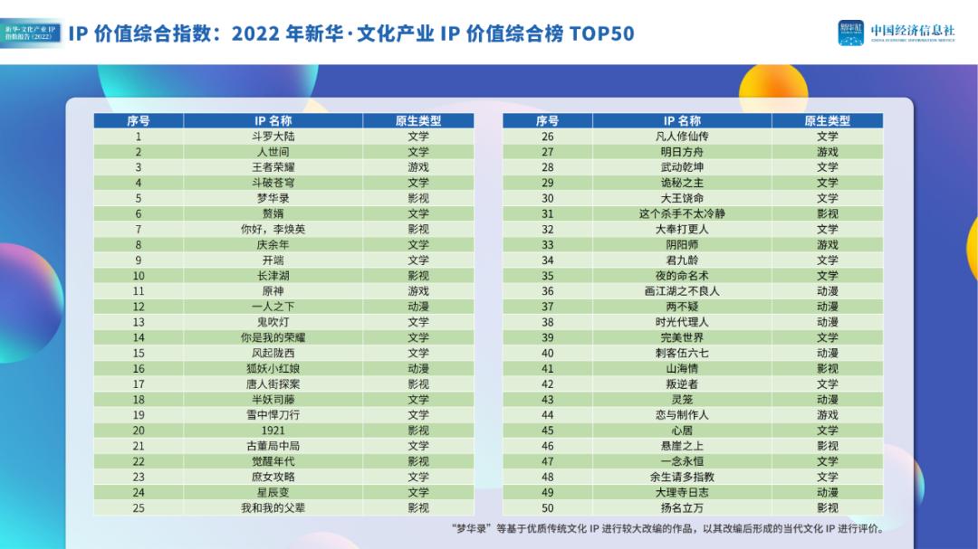 这个概念已经得到了权威机构的认可。11月2日,由新华旗下的中国经济信息社发布了《新华·文化产业IP指数报告(2022)》,《斗罗大陆》位居新华IP综合价值榜单第一名,《斗破苍穹》则在位列第四的同时,成为IP改编游戏潜力价值榜第一名。报告还指出,以“双斗”为代表的头部IP价值聚集效应依旧显著,改编成功率高。