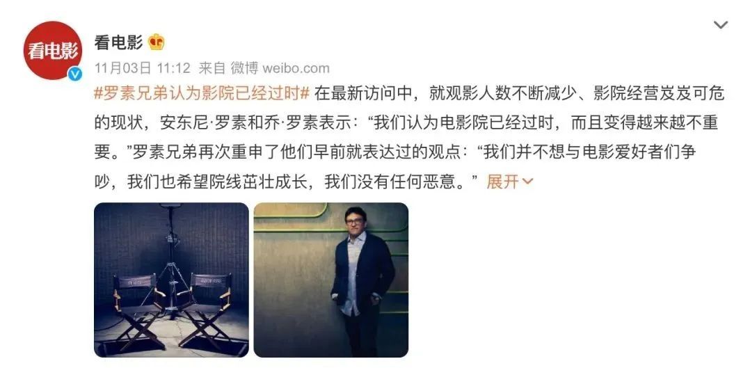 面对这个问题,可能大多数的国内观众都有一肚子苦水要倒。情报君觉得,至少国内观众不去影院看电影,可能仅仅是因为电影院里“无片可看”,或者是因为疫情,而不是其他什么原因。不过,就在近日,曾缔造了《复仇者联盟4》票房奇迹的 罗素兄弟又一次发表了“影院观影已经过时”的看法 。