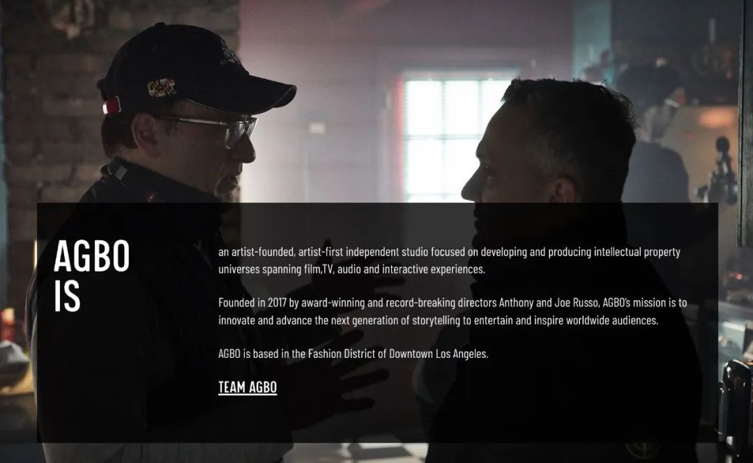 与此同时, 兄弟俩将自己全身心地投入到他们自己创办的导演工作室AGBO当中 。这是一家成立于2017年的独立的导演友好型工作室,由罗素兄弟俩和他们的制片人伙伴迈克·拉罗卡(Mike Larocca)一同创立,负责电影、剧集等一系列影视节目的制作。