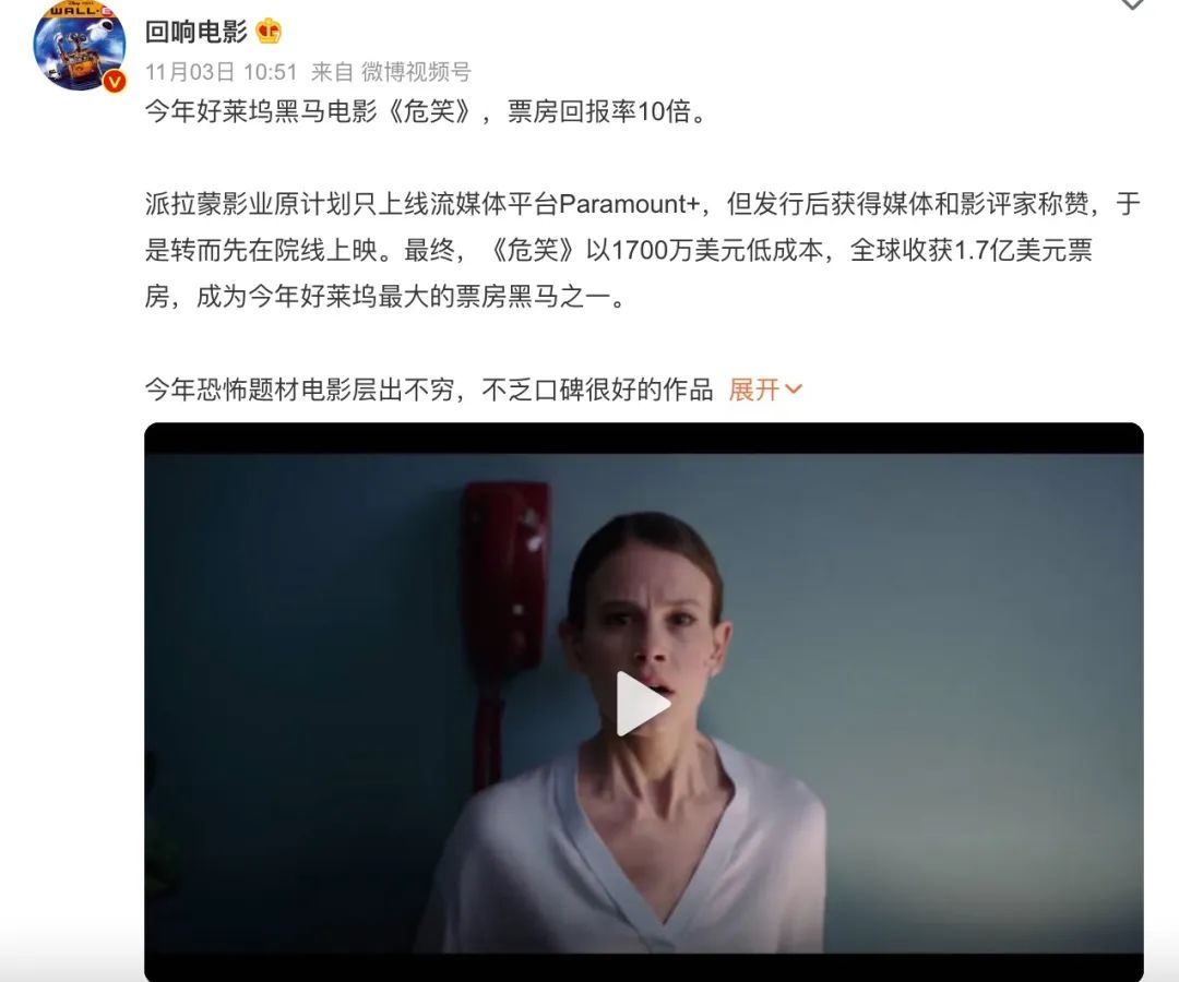 仅举两例。一个月前上映的恐怖片《危笑》,派拉蒙本来也只打算在流媒体平台上发行本片,后因为获得不少业内的好评,转而先在影院公映,最终以1700万美元的低成本,获得了全球1.7亿美元的票房,回报率超10倍。另一部同样是恐怖片《断魂小丑2》,据称制作成本仅有25万美元,如今的全球票房已经接近800万美元。