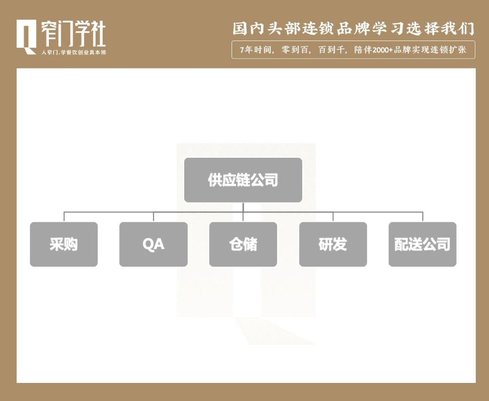 目前传统的供应链部门结构主要以采购、仓配、研发、QA为主,由厨师兼顾研发总监,这种结构下供应链部门一般由老板亲自管理。当然,不同规模餐企供应链部门的职能会有不同。