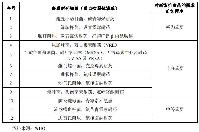 自2017年2月,世界卫生组织列出12种对人类产生最大威胁的多重耐药细菌后,该清单已成为新型抗菌药研发所针对的重点病原体清单。