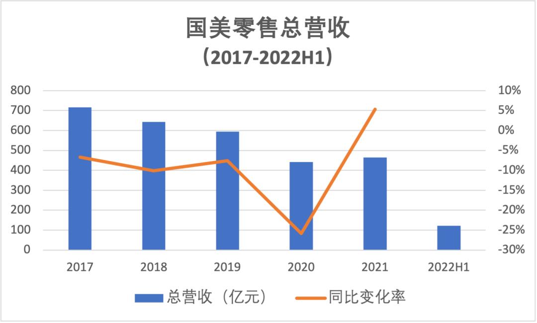 2017年至2021年这五年,国美的营收逐年下滑,从715.75亿元下降至464.84亿元;五年间国美没有一年盈利,亏损从4.5亿元扩大至44.02亿元,累计亏损超过220亿元。2022年上半年的业绩也极不乐观,营收仅为121.09亿元,同比下降53.5%,净亏损29.66亿元,同比下滑250.24%。