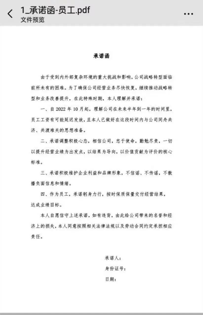 黄秀虹还补充:今后中长期,工资发放也存在不确定性。公司还要求员工签订一份承诺书,内容为“员工理解公司在未来半年到一年的时间里,员工工资有可能延迟发放”“不散播负面信息和情绪”等。员工可以各自去找主管签字。