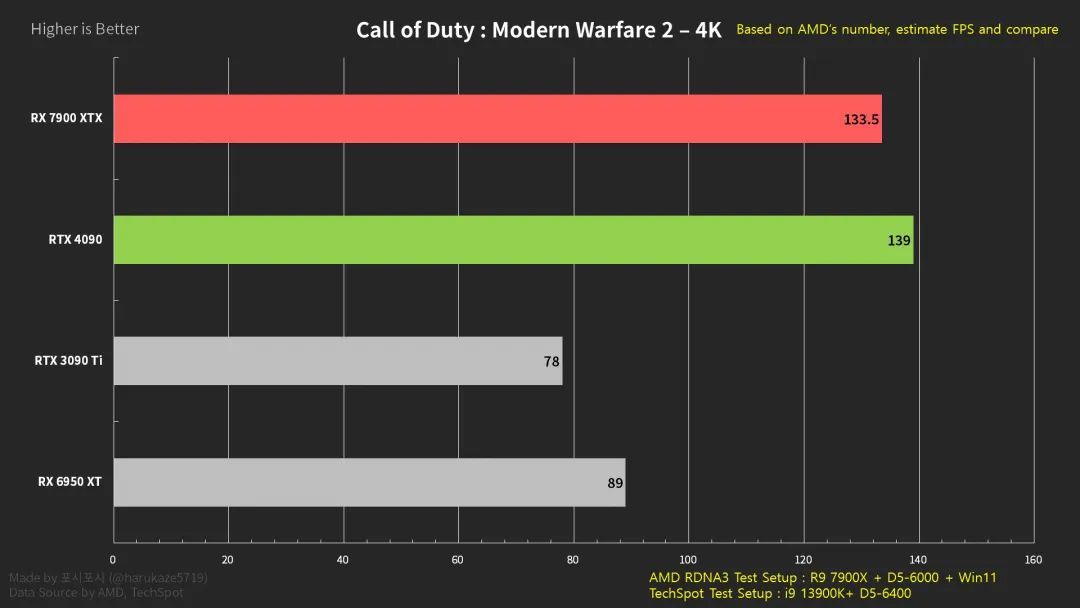 相对于英伟达吹上天的2-4倍帧数提升,AMD似乎看起来要“朴素”许多,当然,考虑到RTX 4090在实际测试中的性能提升幅度其实只有65%左右,总的来说两者的提升幅度相当接近,AMD至少在参数上是有着与RTX 4090扳手腕的实力的。