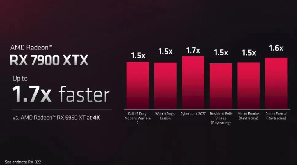 性能上,AMD将RX 7900XTX与RX 6950XT进行对比,在4K分辨率下,RX 79000XTX在《使命召唤:现代战争2》《看门狗:军团》《赛博朋克2077》《生化危机:乡村》《地铁:离去》《毁灭战士:永恒》等游戏都有着最低1.5倍、最高1.7倍的帧数提升。