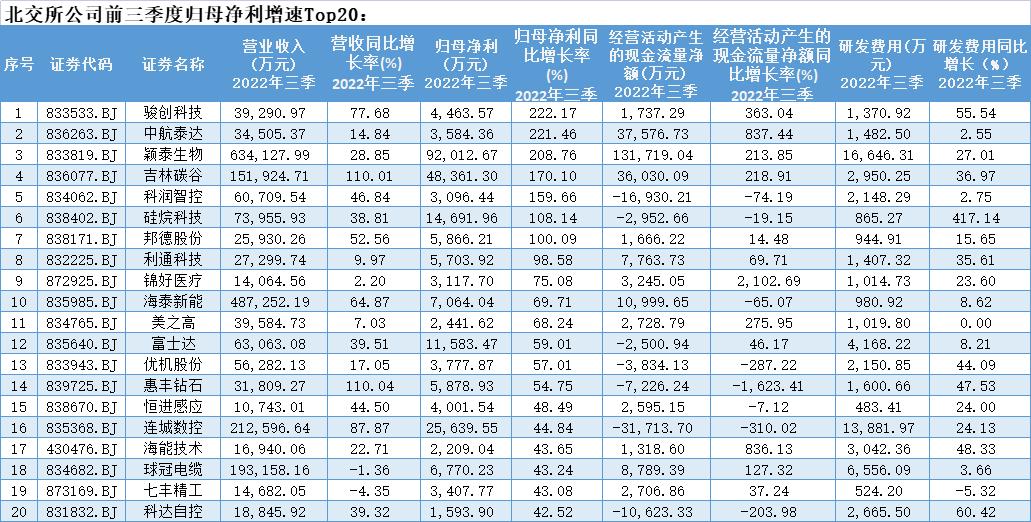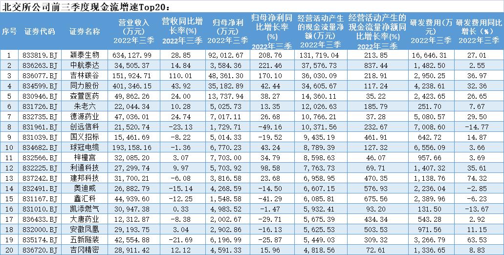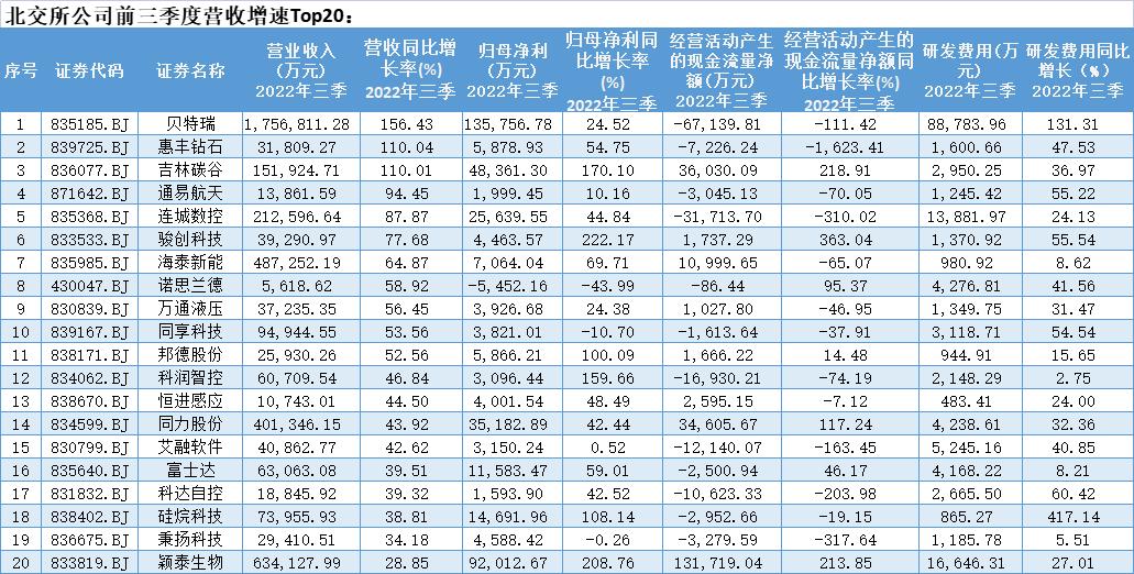 接下来从以上营收增速、盈利增长、现金流增速及研发创新等四个维度,我们来看看北交所前三季度中: