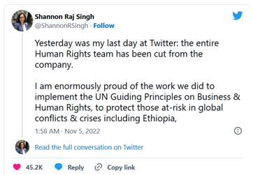 据《连线》报道,一些部门被连根拔起,整体淘汰,比如推特的“AI伦理”部门,以及“权利部门”,其负责监控内容,以在全球冲突与危机期间保护个人。