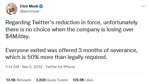 到了下午,马斯克终于发推特表示:“关于 Twitter 的裁员,不幸的是,当公司每天亏损超过400万美元时,我们别无选择。每个退出的人都得到了3个月的遣散费,这比法律要求的要多50% 。”