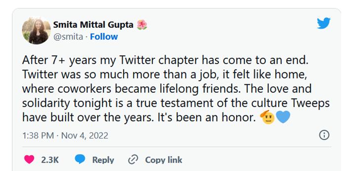 大部分员工没有费精力在表达愤怒和批评马斯克上,而是选择好好道别,发布过去在推特工作的照片,表达不舍的情绪。