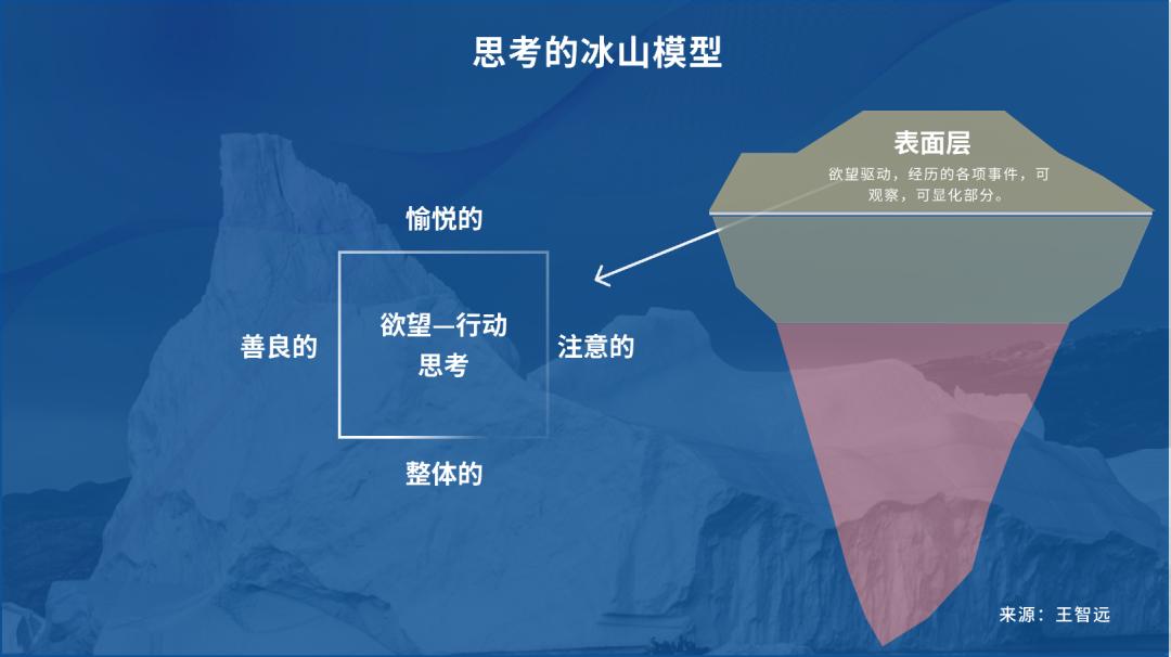 所以,不能用冰山模型单项指标看整体,若从“思考本身”出发,我把它分为表面事件、行为模型、心智模式三个层级。