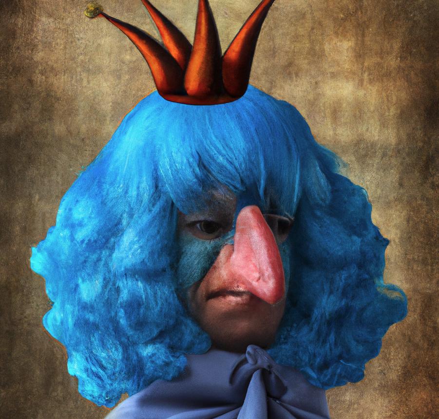 文艺复兴时期的画像,一只戴着小丑假发的蓝叽叽鸟。