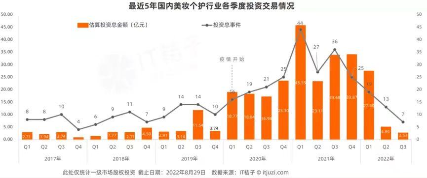 曾跑出过完美日记、花西子的新国货美妆赛道,也在被VC抛弃。据IT桔子数据,2021年前三季度,该赛道共发生投资事件107起,投资规模102亿元,而今年前三季度仅39起,融资额45亿元。