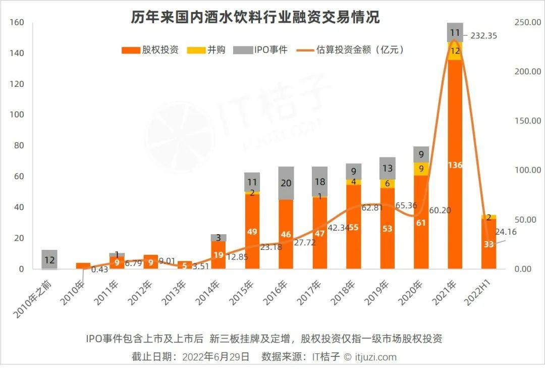 以酒水饮料行业为例,2021年,酒水饮料行业共发生投融资事件136起,投资总额约232.35亿元,较上年翻了3倍多。但2022年上半年热度骤降,投资总额同比下降84%,投资事件数量同比腰斩。