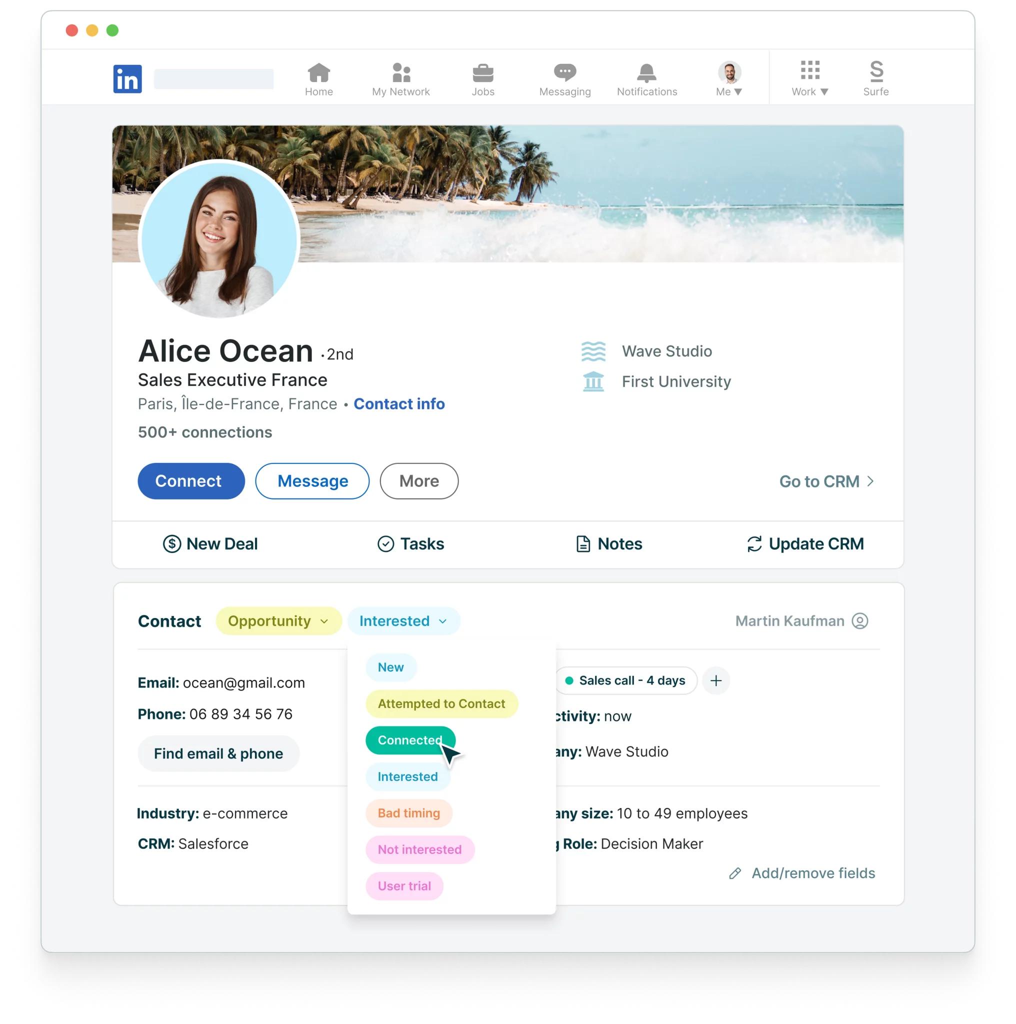 但如今,「Surfe」已经发展成为了一个更强大的工具,能实现双向同步。换言之,现在用户可以直接把CRM系统中的输入导入LinkedIn,因此只需要花时间定期更新CRM或LinkedIn二者其一。