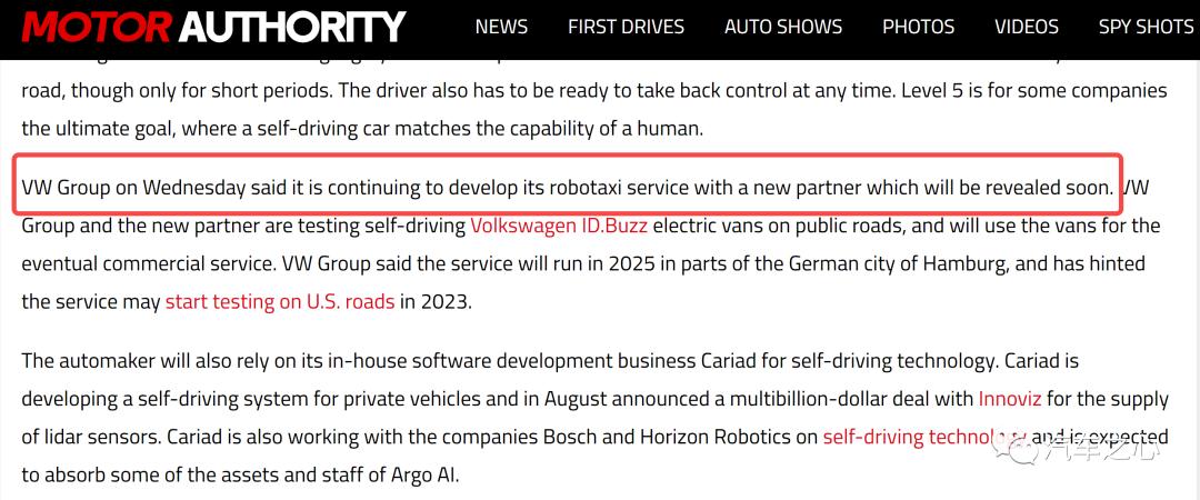 来自海外媒体 Motorauthority 最新的消息显示:大众将与一家新的合作伙伴继续开发 Robotaxi 服务。而这家新的合作伙伴也将很快会对外披露。