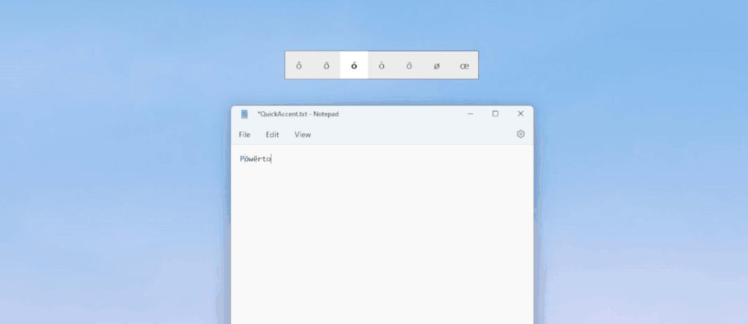 在 PowerToys 中勾选并激活 Quick Accent 后,输入某些字母的特定重音符时,只需按住键盘字母的同时按下向左、向右或者空格键,屏幕上方就会出现重音符选择框,这时我们使用左右键导航到选择需要的重音符号,松开按键即可完成快速输入。