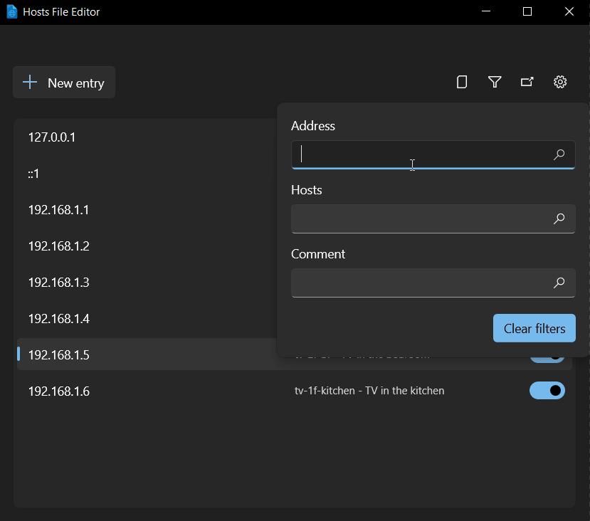 对已经添加好的条目也可以随时进行编辑,或者对其可用的状态进行更新,如果 host 里面的条目比较多,在这个可视化的主机文件编辑器上通过地址、主机、注释上进行筛选来缩小范围也比较方便。