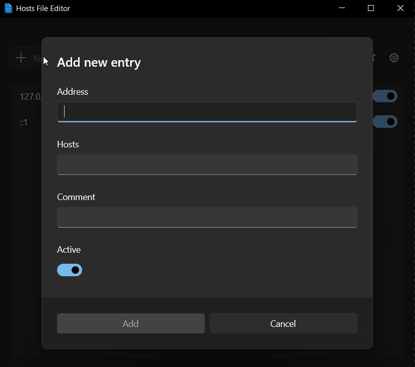 PowerToys 的主机文件编辑器则提供了一套更为直观的 host 文件编辑交互,以新增解析条目为例,我们只需要在 PowerToys 中启动主机文件编辑器并点击左上角的「新建条目」,随后在弹出的「添加新条目」文本框中依次输入 IP 地址、主机(域名)以及方便辨析的注释,勾选可用开关后点击添加即可生效。