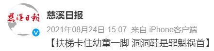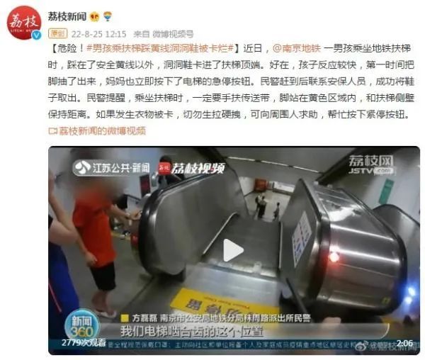今年8月,南京一男孩穿洞洞鞋乘坐扶梯,由于踩在电梯安全黄线以外,导致洞洞鞋卡进了扶梯顶端。
