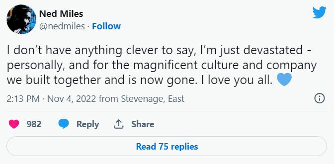 推特伦敦办事处的受众洞察负责人Ned Miles写道:「我没有什么聪明的说法,我只是被摧毁了——我,以及我们共同建立的宏伟文化和公司现在已经消失了。我爱你们。」