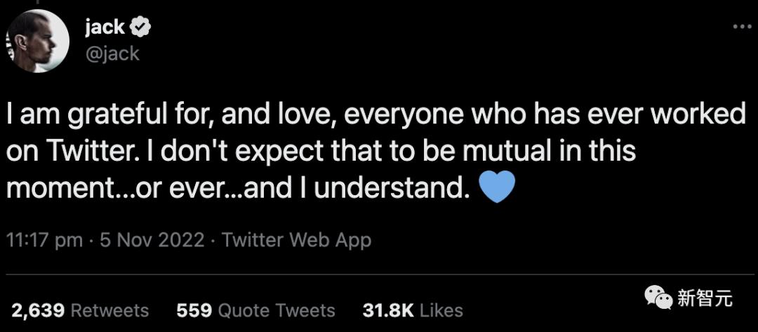 Dorsey继续补充说,他感谢曾经在推特工作过的每一个人。「我不指望你们同样感激我,无论是现在还是未来……」