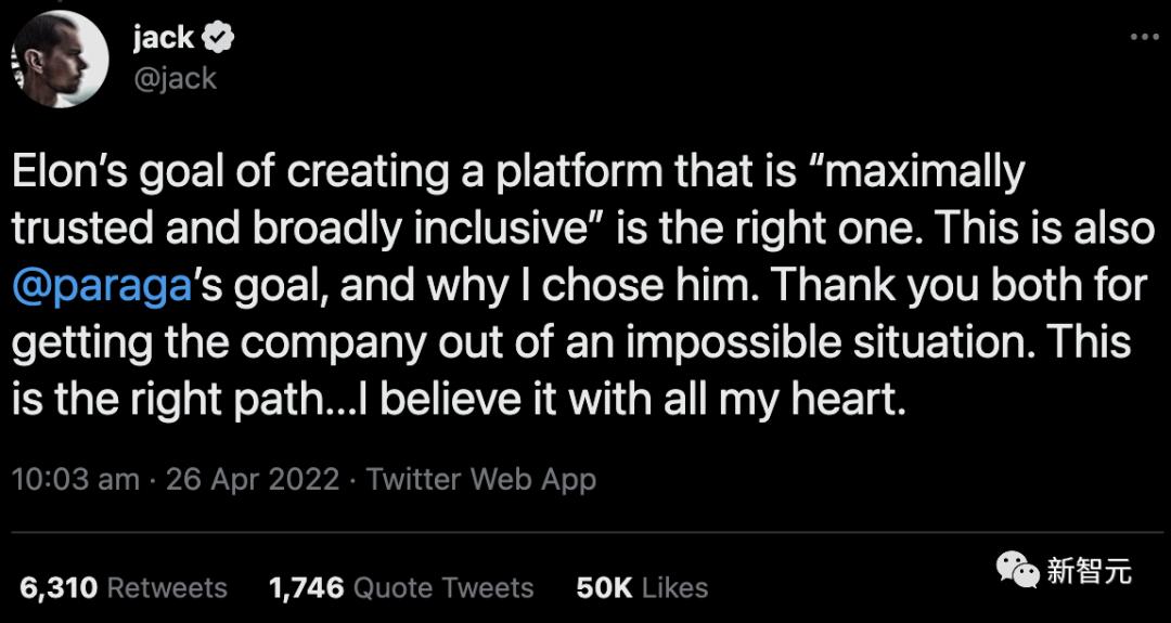 自马斯克在10月27日用440亿美元收购了推特之后,这是Dorsey第一次在推特上发帖。