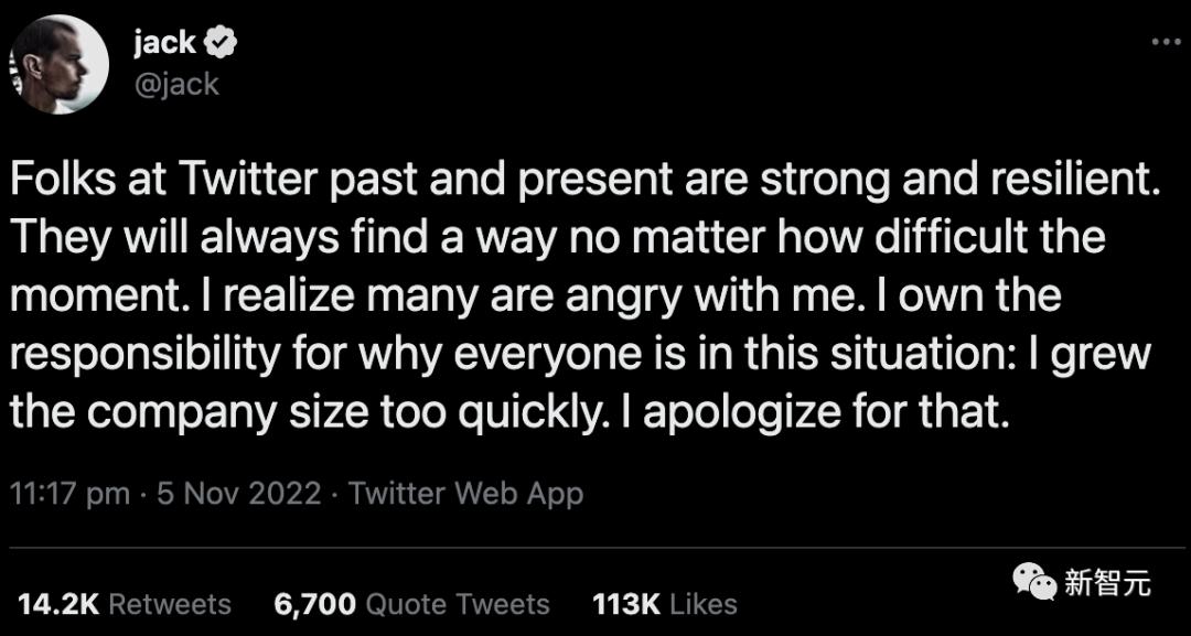 就在马斯克对推特展开「血色清洗」的一天后,推特的联合创始人Jack Dorsey发文称,全公司大裁员是自己的错。