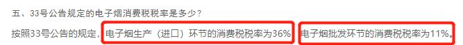 紧接着,11月1日,财政部、海关总署、税务总局联合发布的《关于对电子烟征收消费税的公告》正式执行。电子烟实行从价定率的办法计算纳税,生产(进口)环节的税率为36%,批发环节的税率为11%。