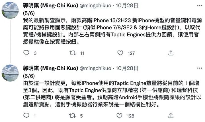 为了提供更有力且更能还原真实的振动反馈,在 iPhone 15 上的 Taptic Engines 线性振动马达之数量也会从 1 个增加到 3 个。