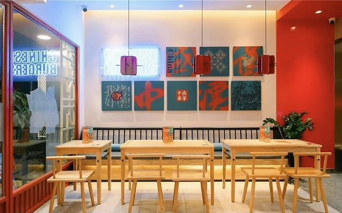 门店方面,塔斯汀以红色、绿色为主要设计用色,配合原木色家具以及挂满店铺墙壁的中国风漫画、毛笔字,打造有别于肯德基、麦当劳等的品牌风格。