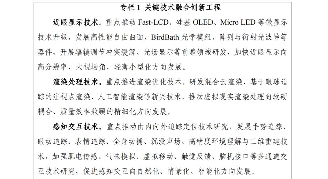 行动计划在专栏1《关键技术融合创新工程》中共提到了七大关键技术分别为近眼显示技术、渲染处理技术、感知交互技术、网络传输技术、内容生产技术、压缩编码技术、安全可信技术。