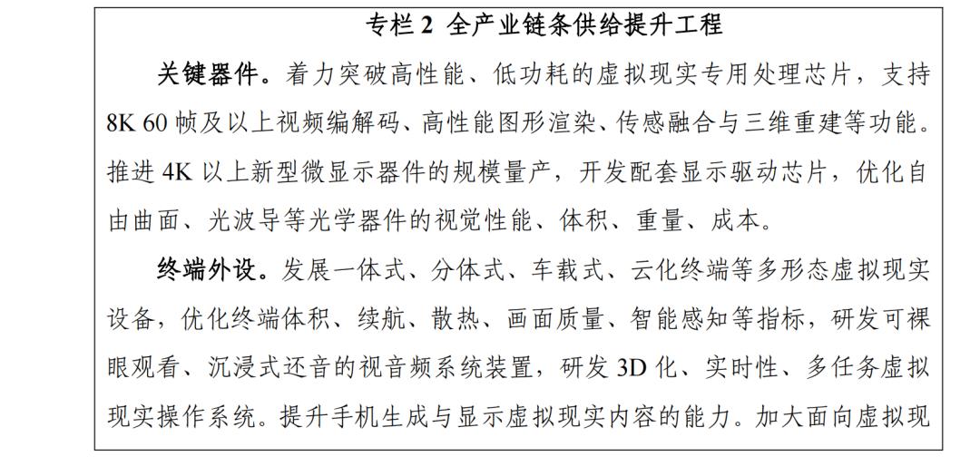 供应链的技术成熟程度决定了一台VR设备的可选项有哪些。在专栏2《全产业链条供给提升工程》中,行动计划给出了目前对于虚拟显示产业关键部件的重点突破,这其中主要讨论VR设备搭载所需芯片的供给能力,包括VR专用处理芯片、显示驱动芯片等。